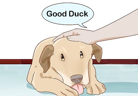 Say “Good duck” when you let it have the treat. Incorporate the command into the verbal praise you offer when it ducks properly. Say, “Yes! Good duck!” with all the giddiness you can muster. Repeating the command when you praise your dog will help reinforce the connection it makes between the sound of the word, the action, and the reward.