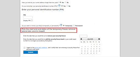 A calendar will pop up that you can use to select the dates. Provide the date that you want the security freeze to be removed, and then the date that you want it to be put back into place.