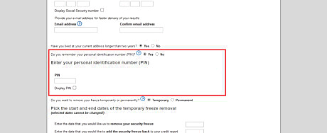 If you know your PIN, then select yes next to "Do you remember your personal identification number (PIN)?", and type it in. If you do not remember you PIN, then leave it at no, and you will have to recover it with the Request your PIN tool. Your PIN number should be in the letter or email that your received when you first requested a security freeze.