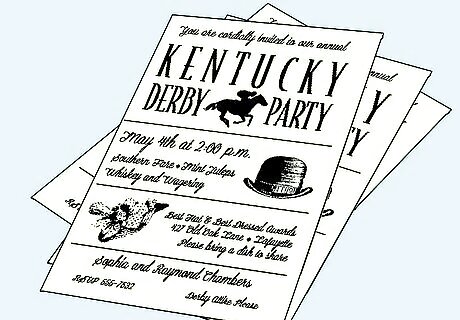 Send out Derby-themed invitations. Set the festive tone ahead of time with nicely-decorated invitations. There are many decorative options available. Floral patterns, roses, polka dots, and bright colors all convey the mood of the Kentucky Derby. Look online for designs you like, put together your guest list, and send them out. Make sure to tell your guests the date and time for the party, and if they should bring anything. Many websites give you a template to design your own cards. Use this option for an invitation unique to your party. If you’re planning any games, events, or a dress code, let your guests know on the invitation. Check online for digital invitations as well. These save paper and your guests can’t lose them.