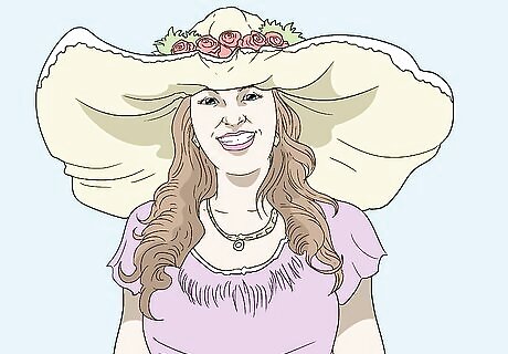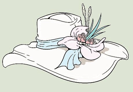 Wear a derby hat. Large hats are a popular fashion choice on Derby day. Common choices are bowler hats with a flat brim, or larger sun hats with a wide brim and tiled to the side. Match the festive atmosphere with brightly-colored hats. Other popular hat choices are fedoras, flat caps, and porkpies. People also wear bows or flowers in their hair if they don’t want to wear a full hat.