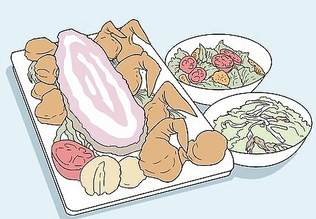 Cook or cater Southern-themed food. Food is a huge part of any party. There is no official Kentucky Derby dish, but make sure the menu is generally Southern-themed to capture the mood of the event. Either order the food from a caterer or put some dishes together yourself. Chicken wings, ham, and pot roast are all good meat choices for the menu. Small sandwiches are another popular option. Try one or 2 of these to give your guests a range of options. Salads, biscuits, cheese plates, mac and cheese, and deviled eggs are popular side dishes for the party. Feel free to make twists on any of these items, or more. Be creative and give your guests a great meal. If you don’t want to cater the entire meal, make a potluck-style party instead by asking all your guests to bring a small item.