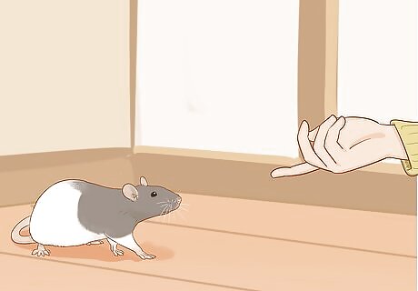 Teach the rat to come when called. Place your rat a little bit away from you. Hold a treat out so your rat notices it. When it comes to get the treat, reward it by giving it the treat. Don’t pair a verbal cue with the action and reward until your rat can perform it consistently. Once the behavior is 100% consistent, start pairing the hand signal with a verbal command such as “come.” Repeat the word while the rat comes to you and gesture with your hand, such as by motioning towards yourself. When the rat comes to you, give it the treat and praise it with pets or holding. If your rat's name is more than two syllables long, try using a nickname or shortened version instead.Tip: Try a shorter distance at first, then longer as your rat starts understanding the concept.