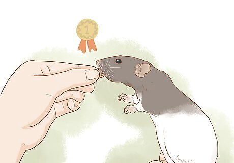 Use positive reinforcement to encourage your rat. The best way to train a rat is through positive reinforcement. Your rat will want to perform for you if it knows it will get a treat! This encourages the rat to perform the desired action so it can get the treat. You can use rat treats that have been cut into small pieces, verbal praise, and toys as rewards.Tip: You can phase out the treats slowly as your rat gets better at responding to your cues. Start giving a treat only every other time your rat performs the desired behavior, then every third time, and then not at all. Reserve treats for teaching your rat new tricks.