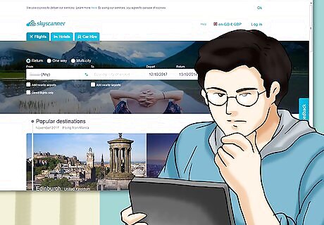 Comparison shop for airfares. Check discount airfare sites, like Skyscanner, at least once a day looking for deals to your destination or just a low price ticket anywhere. The more flexible that you can be with your destination and dates, the better options you'll get. Don't be afraid to travel budget airlines, as they'll likely offer fewer amenities but cheaper fares. Sign up for email or text alerts on the websites and they will reach out to you when prices drop. You can also sign up for an app, such as Hopper, which will track flight prices for you. Before you press that final “Book” button, make sure that you know exactly what you are getting, including any associated taxes or fees. For example, some websites may tack on extra administrative charges to the initial price.