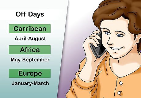 Go during the off-season. Most places have a tourist off-season when fewer people come and prices drop. For the Caribbean, this is usually April to August. Europe's off-season is January to March. Visitors to Africa find better prices from May to September. You can also contact your accommodations directly prior to booking and ask them when their off-season begins and ends. Off-season often coincides with less than ideal weather, so make sure that you consider this when packing your bags.