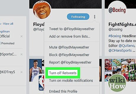 Click Turn off Retweets. You will no longer see this user’s retweets in your feed. To re-enable retweets for this user, click ⁝ and select Turn on Retweets.
