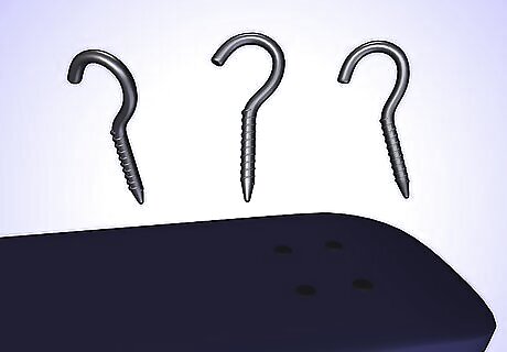 Attach the hat hanging hooks to the board. Plan where the hats will best fit (perhaps even three or four hooks across the board will work well). Attach as instructed by the hook packaging, either by screwing in or adhering to the board. Avoid placing hooks over the deck holes, as these are going to be needed for the mounting process. If drilling holes to add the hooks, take care to find areas of the board firm enough to handle the drilling without breaking the board.Turn Your Skateboard Into a Hat Rack Step 3Bullet1.jpg Another alternative to attaching hooks is to use hooks that are usually hung over a door or similar high spot. Such hooks could simply hang over the top of the board and can be easily shifted for adjusting the weight and placement of hats as needed. This leaves the board intact too. On the downside, these hooks might not be as stable as ones firmly attached to the board.Turn Your Skateboard Into a Hat Rack Step 3Bullet2.jpg