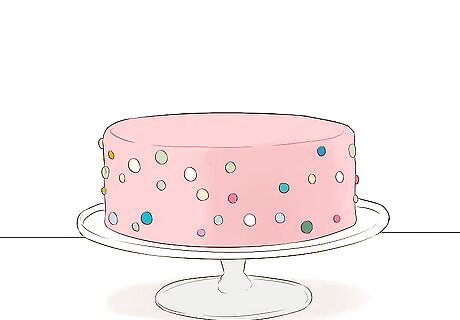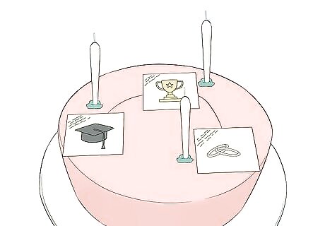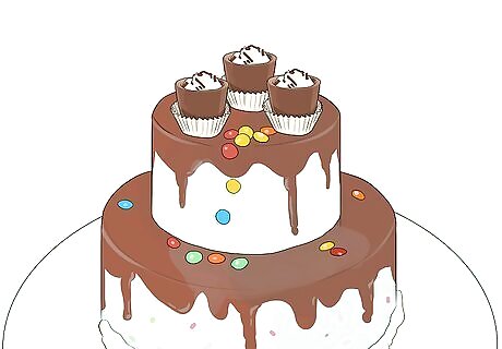 Make a toasting cake. Cover the top of a two or three layer frosted cake with edible chocolate shot glasses or small cups. Push them into the frosting to make them stable. Very carefully, fill each vessel with whatever drink you choose. Flavored milk comes in one serving sizes, so you can mix up colors and flavors of the toasting drinks. Or go with something stronger. It is fun to make an entrance carrying this toasting cake. The participants can toast the guest of honor and then eat the chocolate cups. Candy cups are available at places that sell gourmet foods and stores that sell cake decorating supplies. Plastic shot glasses are fine to use, too.