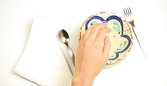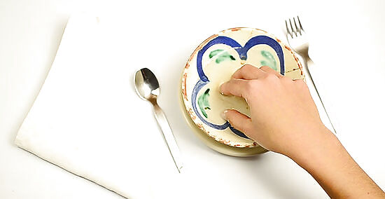 Repeat the process with the fingertips of your opposite hand. Hold the hand you finished cleaning in between the napkins on your lap. After dipping your other hand into the water, bring it down to the napkin and gently dry your fingers. Always bring your fingers to the napkin—never the other way around.