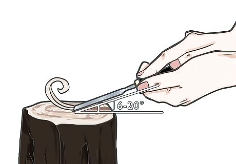 Carve with the chisel at a 16-20 degree angle with the bevel side facing up and the flat side against the wood surface. Carve one small and thin shaving at a time. Forcing and cutting into the wood can damage the chisel or split the wood you're working on. Hammering the chisel as a last resort, or when removing knots, making tenons and mortise holes.