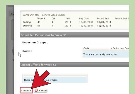 Advance to the next pay cycle. Click on the green “Start New Cycle” icon. A popup window will appear that displays dates and deduction information for the upcoming pay period. Verify the week number, pay date and period end date. If you need to change any of this information, click on “Change Starting Week” to update it. Also, verify the scheduled deductions and special effects for the pay period. If all of this data is correct, click “Continue” in the bottom left-hand corner of the window.