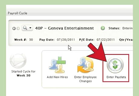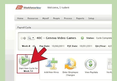 Start a new cycle. This is how you begin each new pay period. This step clears out all of the data from the previous pay period. Then, it advances the system to the new pay period. Go to the payroll cycle page. Click on “Process” in the task bar at the top of the page. In the pop-up menu, under “Payroll,” select “Payroll Cycle.”