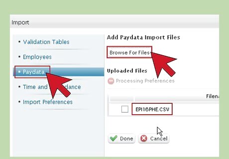 Import paydata from an Excel spreadsheet. You can import paydata from your external Excel file into the ADP system. First you have to upload the file to the ADP server. Then you can import the data into the paydata grid. From the “Process” menu select “Import.” You will be directed to an import window. Select “Paydata” from the options on the left. Click on the green “add” button. Select “Browse for Files” and choose the file you want to upload. Once your file has uploaded, click “Done,” and you will be returned to the Import Paydata window. Now the file has been copied to the ADP server, and you want to import it to the paydata grid. Select your file from the list. Select the “other actions” and click on “start.” When the import is finished, a “Success” message will display in the window. Now you can return to the Paydata page to edit your batch if needed.