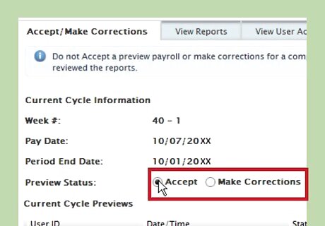 Finalize your payroll. This step allows you to verify the accuracy of the payroll once it’s been calculated. In the Payroll Cycle window, click on the “Preview Results” icon. You can review total payroll information for the entire company. Also, you can drill down to verify payroll information by department or for individual employees. If you find incorrect information, click “Make Corrections” and edit the payroll batch. Then you will have to go back to the previous step and recalculate the payroll, and then run “Preview Results” function to verify the payroll once more. Once you are sure everything is correct, click on “Accept and Finalize Payroll.” A popup window will appear asking you to confirm. Click “OK,” and your payroll information will be sent to ADP for processing. Return to the Payroll Cycle homepage. You can see that the payroll for this pay period was accepted. Also, the “Start New Cycle” button is green once again. Now you are ready to start a new payroll cycle.