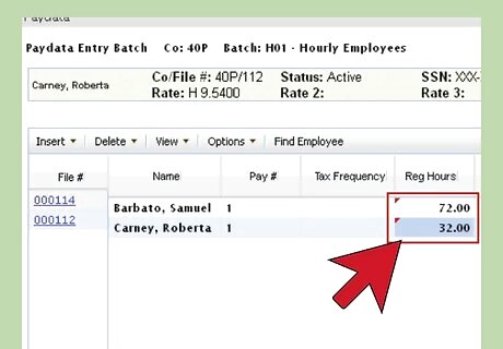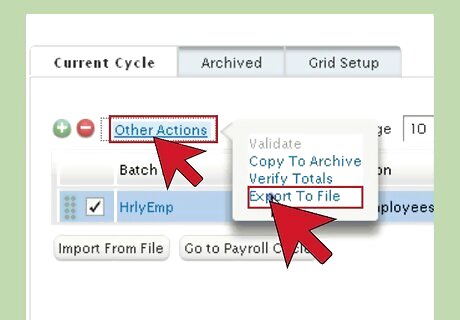 Set up employees to be paid. This is the process for entering data for your salaried and hourly employees who are not set up for Automatic Pay. You enter paydata in batches, which are groups of employees. You can use previously-created batches, or you can create and customize new batches. Click on “Process” in the task bar at the top of the page. In the pop-up menu, under “Payroll,” select “Payroll Cycle.” You will be directed to the Payroll Cycle page. Click on the “Enter Paydata icon” and select “Paydata” from the popup menu. You will be directed to a window where you can create a payroll batch. If you have already grouped employees into batches, the batches will be displayed in this window. Select the batch for which you want to enter paydata and click on “Go to Payroll Cycle.” If you want to create a new batch, click on the green “add” button. Add an alphanumeric code to identify the batch, and write a description so you know which category of employees is included in the batch. Select the paydata grid you want to use, depending on how you want your paydata displayed. Click on “next,” and you will be directed to a page that lists all of the employees in the company. Select the checkboxes next to the names of the employees you want to include and click on “Create Batch.” You will now see the paydata grid for the batch. Here is where you can enter any paydata information.