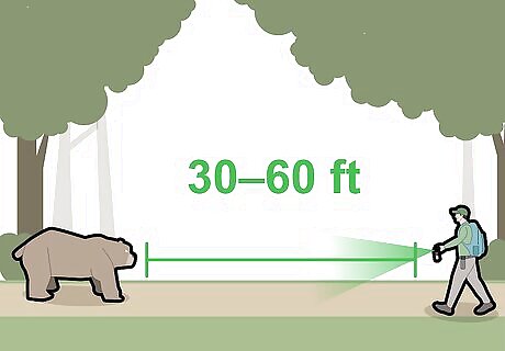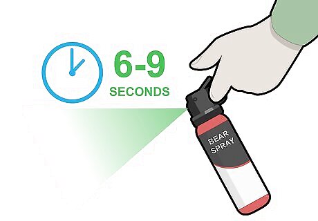 Release a steady stream when the bear is about 30–60 ft (9.1–18.3 m) away. The spray will shoot out about 25 ft (7.6 m) in front of you, depending on the wind. If you spray and the bear is further than 30–60 ft (9.1–18.3 m), the cloud could disperse before the bear reaches you, and it won't be effective. You don't necessarily have to be precise when you aim the can, since the spray will expand into a cone as it travels. However, if the bear gets close enough, point the spray directly into its face. If the bear is charging or veering directions, wave the can in a Z-shape to create a wider barrier.