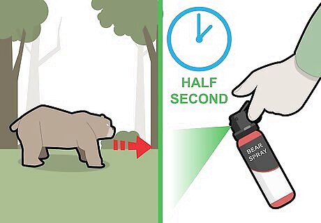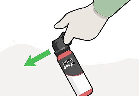 Aim the nozzle of the can down slightly. The cloud will expand out and up, so a slight downward angle will help cover the entire area. In addition, aiming downward will ensure the bear can't run beneath the spray. You also might need to adjust for the angle and strength of the wind.