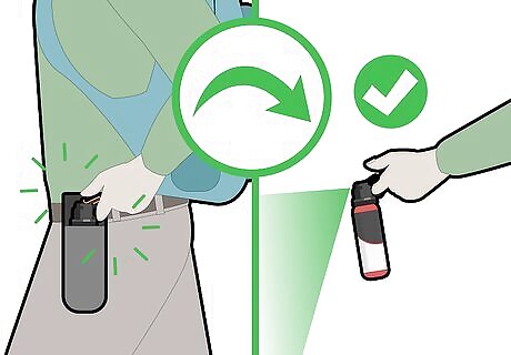 Keep your bear spray in a quick-draw holster when you're hiking. Put the spray somewhere that’s easy for you to reach, like a chest clip, in the pocket of your cargo pants, or clipped to your belt. Don’t leave it in your pack, since in an emergency situation, you might not have time to access it. If the temperature will be less than 40°F, wear the spray close to your body. At cold temperatures, the propellant could become ineffective, so the spray won't work. If you’ll be camping overnight, keep the spray in your tent while you’re sleeping, next to your flashlight. Don’t carry the spray in your hand if you can avoid it, as this could lead to an accidental discharge.