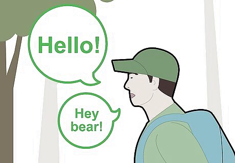 Make noise while you're hiking. Periodically yell something like, “Hello!” or "Hey bear!" to let the bears know you're in their territory. This is especially important if you're in an area that's especially dense or loud, such as somewhere with heavy vegetation or flowing water. Often, bears will move away from an area with human noise.