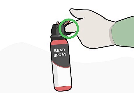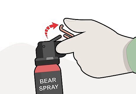 Remove the safety tab or clip with your thumb if the bear approaches you. If the bear comes toward you, prepare the can in case you need to use it. These cans are generally designed to be used with one hand, so in most cases, you just flip the clip backward with your thumb to remove it. If you practiced with the can before the trip, this movement should come naturally, even if you’re feeling anxious about the bear. Never remove the safety tab until you're ready to use the bear spray. You could accidentally deploy the canister, making it useless in the event you do come into contact with a bear.