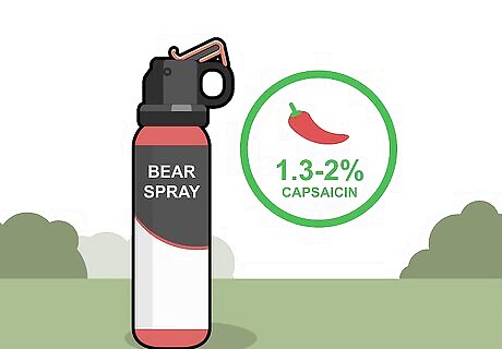 Choose a bear spray that is 1.3-2% capsaicin and related capsaicinoids. You can find different concentrations of capsaicin on the market, but 1-2% sprays are the most common. To ensure that your spray is strong enough to ward off a bear attack, look for one that’s at least 1.3% capsaicin, but no more than 2%. Just because a spray has a higher concentration of capsaicin doesn’t necessarily mean it will be more effective. Often, these sprays tend to clog the nozzle and don’t disperse as well.