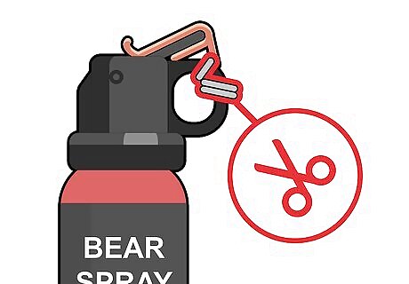 Remove the plastic cable tie from the nozzle before you go hiking. Many times, bear spray is sold with a plastic zip-tie attaching the safety clip to the can. Cut off the plastic tie with a pocket knife or a pair of scissors before you head into bear country. This tie prevents the can from being discharged before it gets to the consumer, but you don’t want it on the can if you’re faced with a bear.