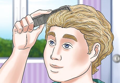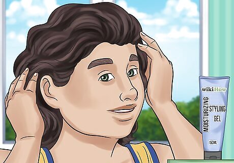 Slick down each section of hair. Hold one handful of hair near the base. Rub the gel onto it a short distance above the roots, then spread it evenly down the hair using your fingers or a comb. As you go, the gel should smooth down stray strands and weigh down your curls closer to your head. You may not need to apply the gel all the way to the tips. Applying too much gel to the ends of your hair can weigh it down, reducing volume and bounce. If you want to keep a curlier hairdo and just fight frizz, scrunch your hair with the gel instead.