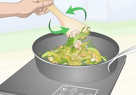 Stir-fry your food for a quick, flavorful option. Use a few teaspoons of a healthy cooking oil, like extra virgin olive oil or avocado oil, and add in your chopped veggies and protein for a 10-minute meal. Because the cooking time is so short, there is less time for your ingredients to lose their healthy nutrients. Try stir-frying mushrooms, zucchini, peppers, onions, and chicken for a tasty dinner option. Add a little bit of low-sodium soy sauce and some garlic to the dish for some extra flavor. Your body does need some fats in order to function at its best, so its okay to use heart-healthy oils. Avoid using butter, lard, and sauces that are high in calories, fat, and sugar.