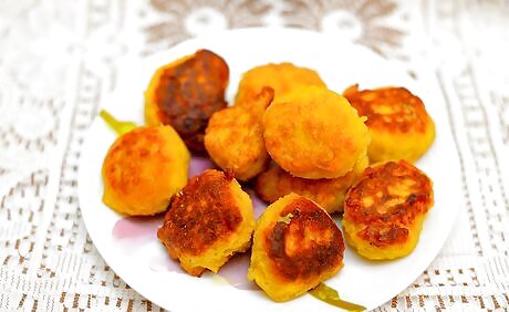 Make tater tots. Roll small balls of cold sweet potato casserole filling in a crispy tater tot coating. Dip the balls in an egg white so that a crispy coating made with panko (or breadcrumbs), almond meal, and seasonings sticks. Bake the tots until they're crunchy and golden brown. You can serve sweet potato casserole tater tots with your favorite dipping sauce. Try a yogurt ranch dip for a creamy taste.