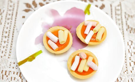 Bake sweet potato appetizer bites. Create elegant party food with just a few simple ingredients. Buy filo dough cups and just scoop a little of the sweet potato casserole filling into them. Top each cup with a few mini marshmallows and bake them until the filo crisps and the marshmallows puff up. You should serve these appetizer bites right away since the pastry will become soggy as it sits.