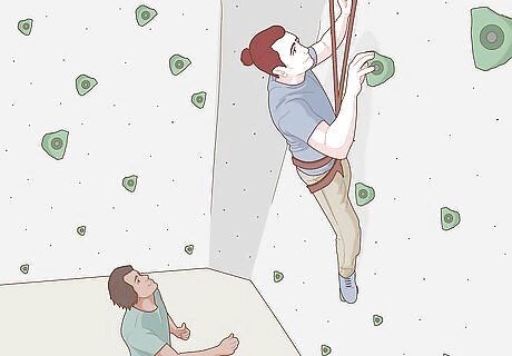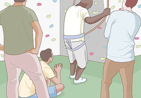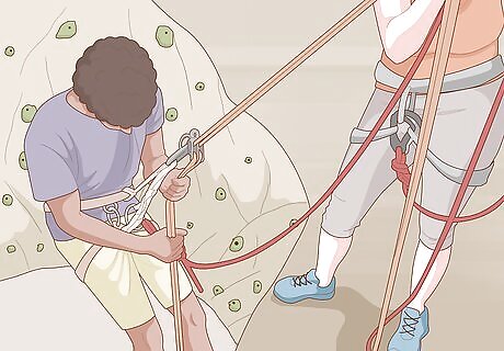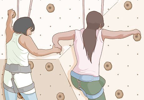 Have pairs do basic supported climbing to learn how to climb together. Designate each pair to work with an instructor to learn basic climbing skills such as proper foot and arm placement, how to use each piece of their gear, and how to communicate with each other to be effective climbers. This way, all of your team members will have equal climbing skills, while each pair of team members will have a shared learning experience. During the training session, team members can encourage and support their partners to help them learn the necessary skills for rock climbing. This is a great way for the paired team members to build bonds with each other.