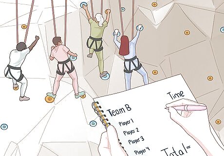 Do speed climbing races to build confidence and camaraderie. Each group member will climb a section of rock as fast as possible and have their individual time recorded. Then, each group will add all of their members’ individual times together to come up with a total time for the group. Whichever group has the shortest time wins.Tip: Be sure to maintain a lighthearted and fun atmosphere during the race. If group members start to feel overly competitive, this will do more harm than good to the overall team building effort.