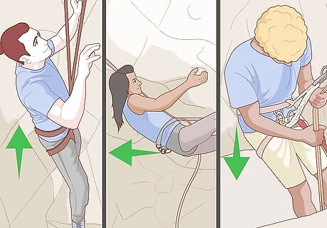 Perform blind climbs where 1 partner guides the other from the ground. Once both members of a pair have mastered the basics of climbing, this is the next step toward building a stronger sense of trust between team members. As 1 partner climbs, have the other partner verbally guide them toward nearby holds and grips.Warning: This is a dangerous way to rock climb, so only attempt blind rock climbing with secure safety equipment and after all team members have received the basic training.