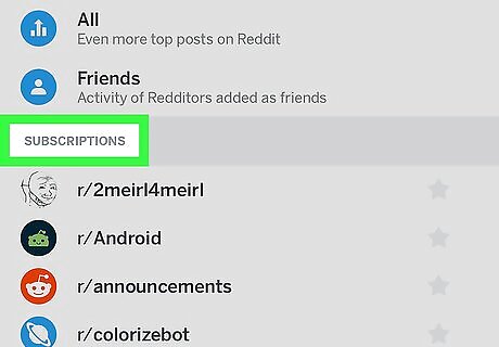 Scroll down to the “Subscriptions” section. All of the subreddits you're subscribed to appear in this section. Tap a subreddit to view its contents. To unsubscribe, tap Subscribed at the top-right corner of the subreddit.