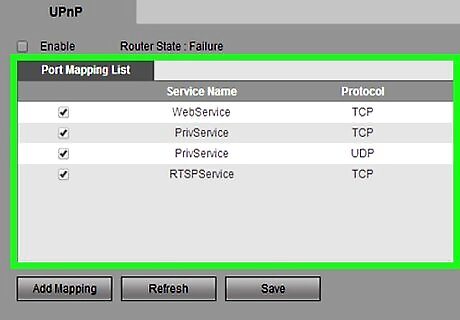 Perform the port forwarding. In your camera’s web console, click on Setup tab and then Open Network > UPnP menu. In order to manually perform the port forwarding in the modem/router, you may uncheck “Enable” box, and let the “Router State” remain in failure state. Click on Save button to save the changes.