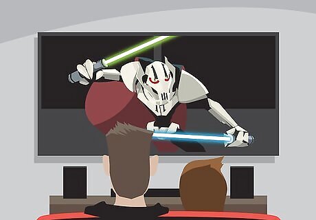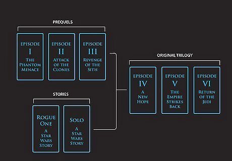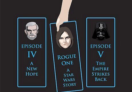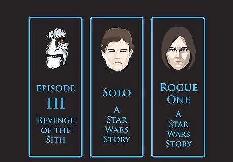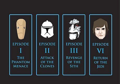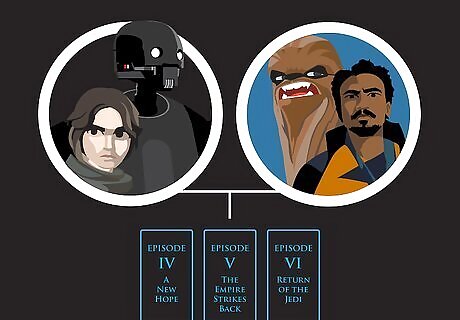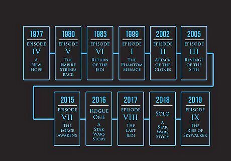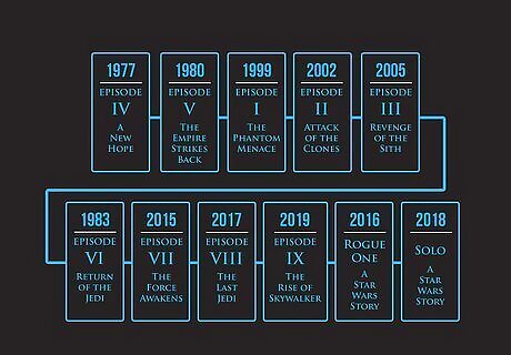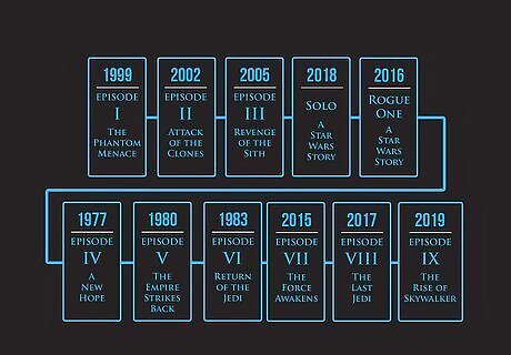 Opt to view the films chronologically to fully understand the story line. One of the major downsides of watching the films in the order that they were released is that the narrative can become hard to follow. This is especially a problem when going from the first trilogy to the prequels and from the prequels to the sequel trilogy. To make the story easier to follow, rearrange the order that you watch the films to put the story in chronological order. Chronological Order: The Phantom Menace (Episode I) - 1999 Attack of the Clones (Episode II) - 2002 Revenge of the Sith (Episode III) – 2005 Solo (A Star Wars Story) (Optional) - 2018 Rogue One (A Star Wars Story) (Optional) -2016 A New Hope (Episode IV) - 1977 The Empire Strikes Back (Episode V) - 1980 Return of the Jedi (Episode VI) - 1983 The Force Awakens (Episode VII) - 2015 The Last Jedi (Episode VIII) -2017 The Rise of Skywalker (Episode IX) - 2019 Since the prequels tend to be a little goofier and lighter than the other films, this is a good choice if you have younger kids that you want to share the films with. It’ll also make the story easier to follow, which can be a problem for younger viewers.