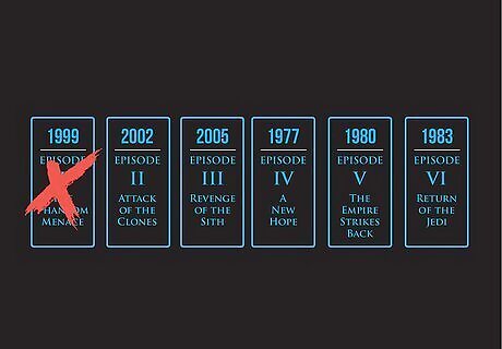 Watch the prequels last and pretend they’re a flashback. Many diehard fans dislike all of the prequels, and choose to put them at the very end of the series to keep the tone, story, and tempo of the original and sequel trilogy consistent. You can even choose to cut them altogether if they don’t seem like something you’re interested in!Tip: Don’t write off the prequels based on everyone else’s opinion. There are people that really love these films, and you may be one of them. If you’ve never seen them, try watching The Phantom Menace and simply turn it off if you get through an hour or so and aren’t hooked.