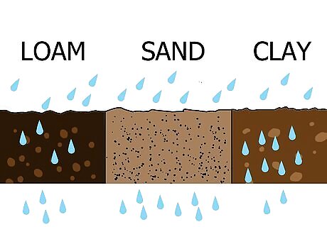 Evaluate your soil type. The type of soil under your lawn, as well as the climate and time of year, will dictate how often you need to water your lawn. If you live in an area that is prone to heavy rainfall during parts of the year, for example, you will not need to water as frequently. Certain yards may not reap the full benefits of rainfall, however, depending on the yard's composition and layout. Certain soil types absorb water better than others. A high composition of clay, for example, will prevent water from absorbing into the soil. Clay tends to retain an average around 1.5 inches of water per foot of soil, while fine sand and loamy sand retain the least amount of water at 0.7 and 0.8 inches of water per foot of soil, respectively. Silty loam, clay loam, and silty clay loam have the highest water retention of all soil types, averaging 2.4 inches of water per foot of soil. The layout of the yard is a factor as well. A sloped lawn will not be able to absorb much excess water. Any moisture not readily absorbed will most likely run off downhill.