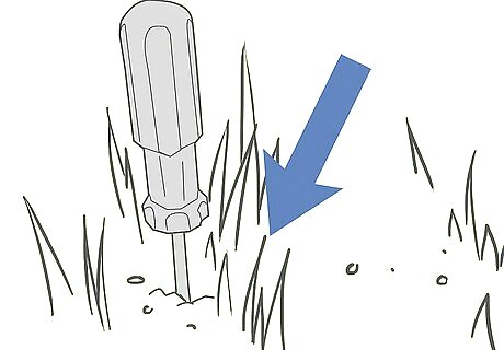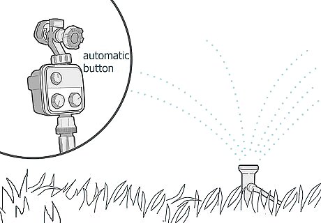 Determine how often to water. While some may feel that the lawn should be watered on a daily basis, oftentimes this is not necessary. Many factors influence how often you need to water your lawn. In drought-prone Southern California, for example, you may need to water your lawn anywhere from 20 minutes per week to 200 minutes per week, depending on the region, time of year, and hourly sprinkler output. Use the minimum amount of water necessary to maintain your lawn. Using too much water will run up your monthly water bill, waste vital resources, and may end up damaging your lawn with over-saturation. The best measure for determining how often to water your lawn is to check the lawn itself. If footprints or lawnmower tracks remain indented in the grass for longer than 30 minutes after passing through your yard, it is a good sign that your grass is getting dry. Check the color of your lawn. Turf grass that is dry will often turn to a blueish-gray shade, rather than a lush green. You can also check the soil moisture to see if your lawn needs to be watered. Drive a six-inch screwdriver or stake into the ground. If the screwdriver breaks through the soil easily and without much effort, the soil is likely retaining enough water and you can hold off on watering.