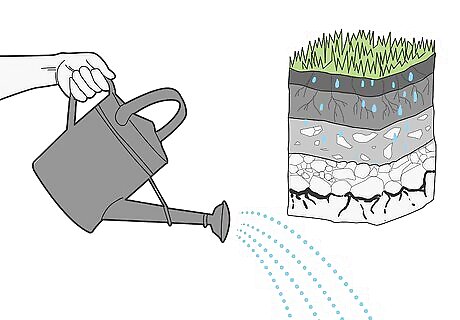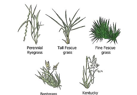 Choose the right grass. While it may seem to the untrained eye that grass is simply grass, there are, in fact, many different types of grass. Each variety has its own advantages, depending on the climate and region in which you live. Perennial Ryegrass is somewhat drought tolerant, easy to establish across the lawn, and can compete well with weeds that sprout up in the yard. Tall Fescue grass is very drought tolerant and has the deepest root system of all turf grasses, running anywhere from three to six feet deep. Tall Fescue doesn't necessarily use less water, but it does use water the same way a deep-root plant would use water. It also stays green during drought, which is advantageous if you live in a drought-prone climate. Fine Fescue grass has a low fertilizer requirement and a high drought tolerance. It can actually go dormant during dry periods when water is absent, and will quickly come back to a healthy shade of green once water is returns. Bentgrass grows well during cool weather, and much like Fine Fescue it can also go dormant during droughts. Bentgrass does not require very much fertilizer, either. Kentucky Bluegrass grows best in cool, humid, semi-arid, and temperate climates. This grass variety is moderately drought-tolerant.