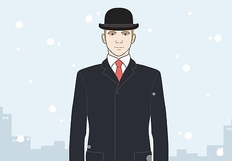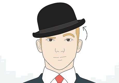 Tilt your hat over your eyes to make yourself seem mysterious. Push the brim in the front of the bowler hat forward so it rests along your brow. This will cause the brim to hang over your eyes and make you seem more intimidating and mysterious. Tilting your bowler hat forward will also cast a shadow over you eyes and provide you with more protection from the sun. If you have a duster or a jacket with a collar, turning your collar up with your bowler hat tilted forward will make you seem even more mysterious.