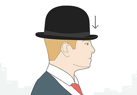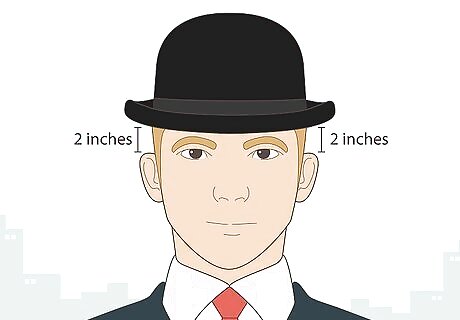 Rest the brim of the bowler cap evenly on your head for a classic look. The standard and classic way to wear a bowler hat is to place it evenly on top of your head so the sides are about 2 inches (5.1 cm) above your ears. The brim of the hat should form an even line around your entire head. If the bowler hat is resting on your ears, then it’s too big for you.