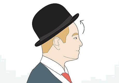 Push your bowler hat back to appear relaxed and open. Lean the bowler hat so it rests more on the back of your head. Align the brim in the front of the hat so it runs more along the crown of your head rather than your forehead. This will make you appear relaxed, friendly, and inviting. Wearing your bowler hat back on your head can cause it to fall off more easily if a stiff wind catches you.