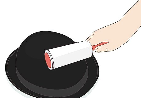 Run a lint roller over your hat to remove dust and hair. Dust and hair that you can’t easily brush off can be removed with a lint roller. Use a fresh sheet and gently run the roller over the surface of the hat to pick up any material you don’t want on it. If you don’t have a lint roller, use the sticky side of some scotch tape to remove lint and hair.