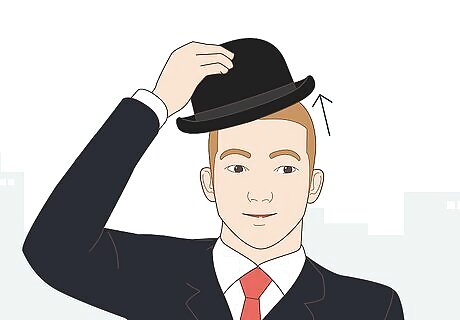 Raise your bowler hat for a more dignified greeting. Grip your hat by the crown above the brim and raise it 1–2 inches (2.5–5.1 cm) above your head whenever you encounter someone you want to show respect, such as your boss or a lady. This shows that you respectfully acknowledge their presence and is a more dignified recognition than a simple touch to the brim of your hat. If you’re walking past someone who is heading in the opposite direction, pause to let them pass as you raise your hat.Tip: Don’t linger for too long or you may make the person uncomfortable. A simple, quick raising of your hat will suffice.