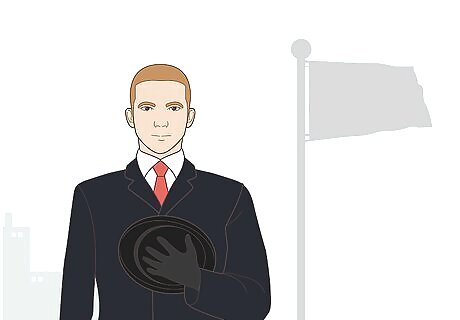 Place your bowler hat over your heart during the national anthem. As a sign of reverence and respect, remove your bowler hat whenever you hear your national anthem playing. Hold it over your heart with your right hand until the song is finished playing. If you’re talking to someone or walking whenever you hear the anthem start to play, stop, remove your hat, and wait until the song has finished playing before you continue.