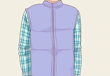 Pop a puffer vest overtop of your checked shirt for a sporty, warm look. This is a nice style for both masculine and feminine looks, and it allows you to completely change the entire feel of your outfit with the addition of just one extra piece of clothing. Because your shirt is checked, pick a solid-colored vest; black, gray, white, tan, and forest green are great shades to choose from. For example, a white checked shirt with a forest green puffer vest will look really nice, especially if the shirt has any lines of green running through it. You can zip the vest up for some extra warmth, or leave it undone to show off your shirt underneath.