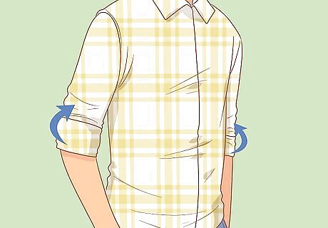 Roll up the sleeves to create a more laid-back vibe. This is a nice option for several reasons: it can help cool you off if you get too warm, and it also adds a nice, effortless look to your ensemble. If your sleeves have buttons on the cuffs, unbutton them first and then roll up each sleeve two to three times. Try to keep the size of the folds equal on each side so they land at the same place. You could even roll up the sleeves on a short-sleeved shirt to expose your upper arms and shoulders.