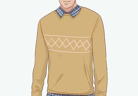Wear a sweater over your checked shirt in cooler weather to stay warm. Consider wearing a solid-colored sweater, like one that is tan, black, blue, or even something brighter, just as long as it complements the colors in the checked top. If the sleeves on your checked shirt are long enough, pull them down so they peek out of the sweater sleeves, and adjust the shirt collar to be visible and sit overtop of the collar of the sweater. Depending on what style you like, choose a pullover sweater or a cardigan—either option looks nice. A checked shirt underneath a sweater will provide a nice pop of color to your ensemble. For a more casual look, choose a baggy sweater. For a classic, preppy style, pick a sweater that is more form fitting.